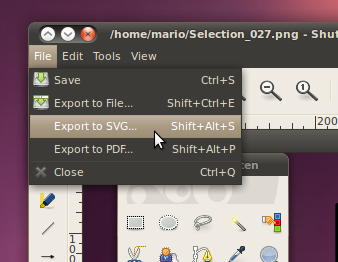 Shutter now uses cairo to render PDF and SVG documents. What does this mean to you? It allows you to export your current drawing to SVG format that can be edited with any vector graphics program, e.g. Inkscape. Additionally PDF Export is integrated in the main program now and can be launched directly from the File menu.